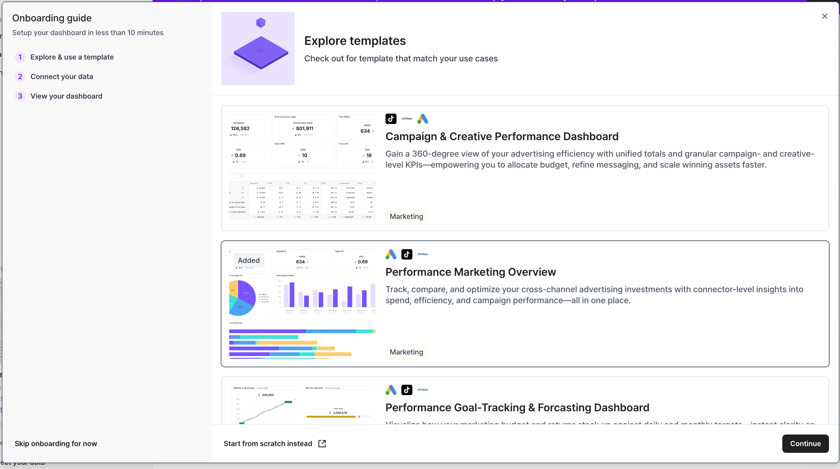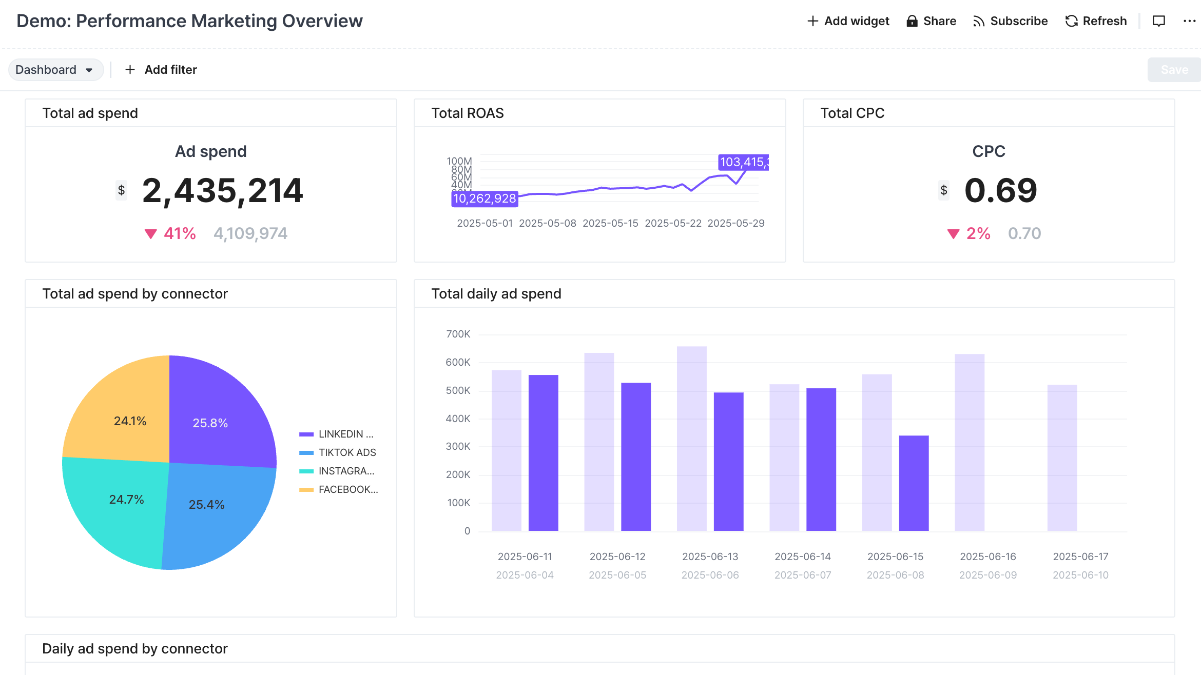When you create a new team, we’ll automatically add demo dashboards and a data model β€” no setup or connection needed.